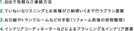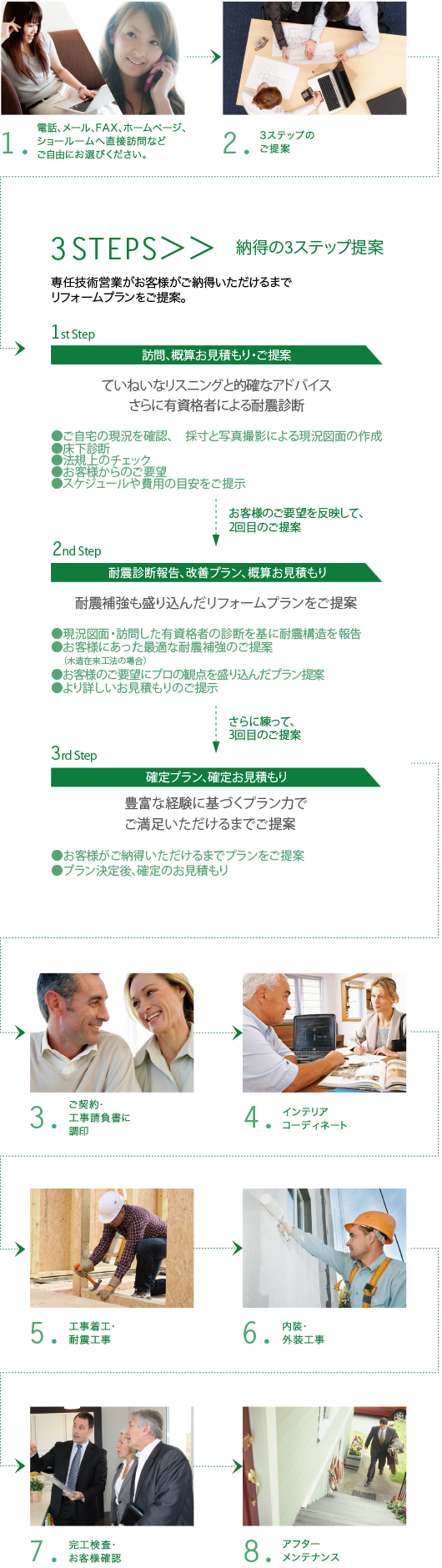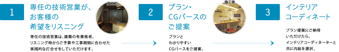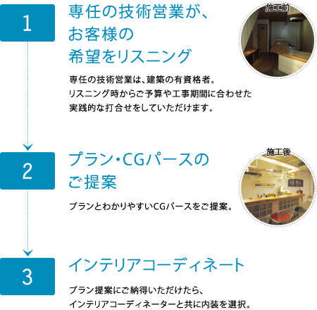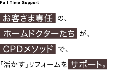 ご自分の住まいをリフォームすること、それは決して簡単ではない重要な決断です。私たちはまず、お客様とお客様の住まいを誰よりも好きになることからはじめ、納得できるリフォーム提案を行います。ご相談からお引渡しまで1人の専任技術営業が一貫して担当させていただくことで、誤解や行き違いのない、スピーディでクオリティの高いリフォームを行います。