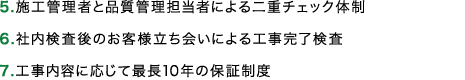 施工中は、状況や精度を各施工管理者が各現場ごとに巡回確認し、専任技術営業と連携をとりながら、施工チェックを行います。