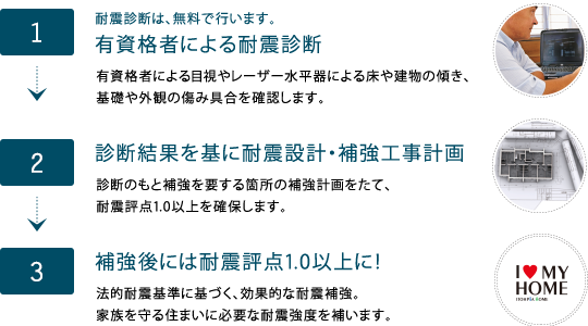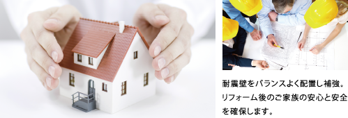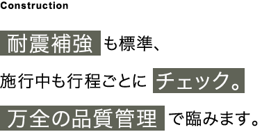 プランのご提案前に、建築の有資格者が耐震診断を行います。その結果をもとに法的基準にもとづく耐震設計を立て、補強工事を施します。また施工中は、各管理者が巡回してチェックや検査を行い、品質管理の徹底に努めます。