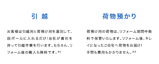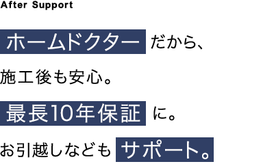 住まいのホームドクターだから、施工後のことも安心しておまかせ下さい。最長10年をはじめとした保証やアフターメンテナンス。さらにお引越しやお荷物預かり、不用品回収を承る「リフォーム楽々パック」など、さまざまなサポートをご用意しています。