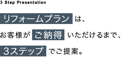 「CPDメソッド」は、お客さまとのコミュニケーションを大切にします。丁寧な診断と対話によるカウンセリングを通して、プランをかたちにします。ご提案は3ステップで。段階ごとに、ご納得いただきながら進めてまいります。