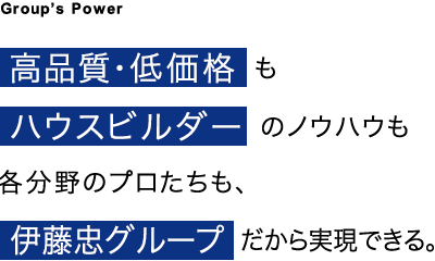 伊藤忠グループというスケールメリット。それが、一貫してクオリティの高いサービスを提供できる理由です。経験豊富な建築のプロ、ハウスビルダーとしての多くの実績、グループ力を活かした低価格など、私たちには強力なアドバンテージがあります。