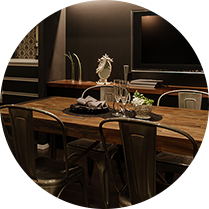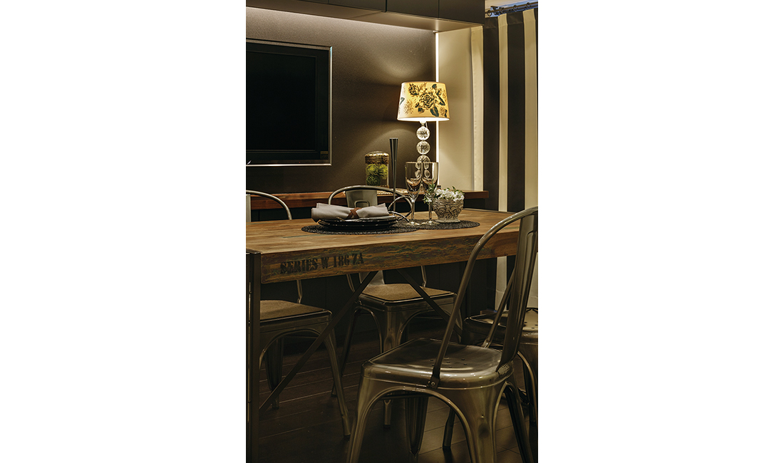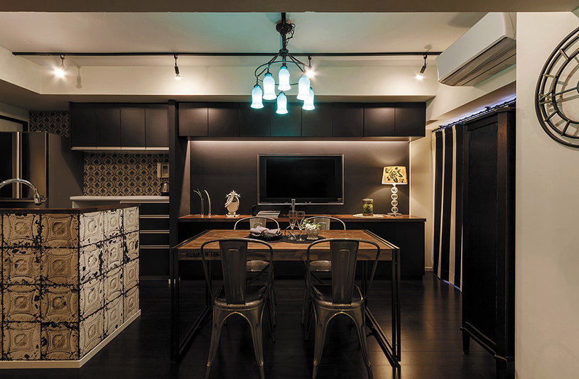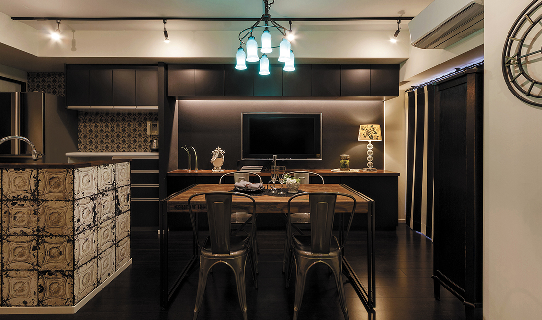 もともとお持ちのユーズド感あふれる重厚なテーブルに合わせて、ダイニングの壁は黒くしてダウンライトも少なめに配置、落ち着いた空間を創り出しました。