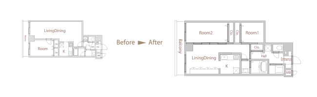 K様邸は1LDKのマンションで、コンパクトな空間。まだ9年と築年数が浅く、きれいな状態なのでスケルトンでのリフォームを行うのは少々惜しいという印象でした。
