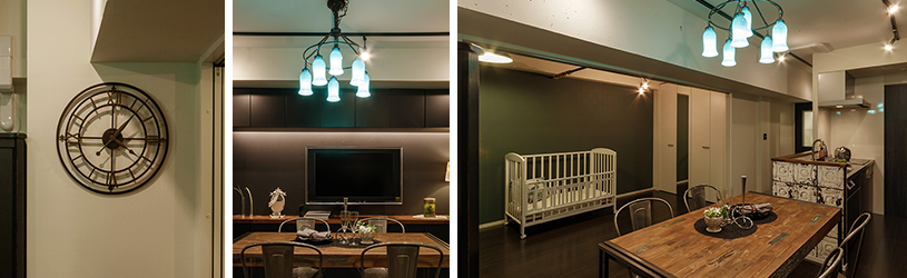 ユーズド・アメリカンとヨーロッパ・アンティークの融合を図る上で重視したのは、ディティール。K様ご夫妻は、照明やインテリア、金具などに強いこだわりをお持ちで、それらがよく似合う空間を思い描いていました。