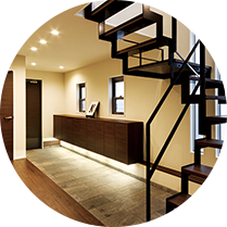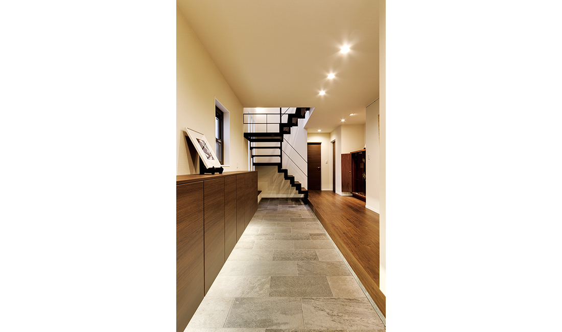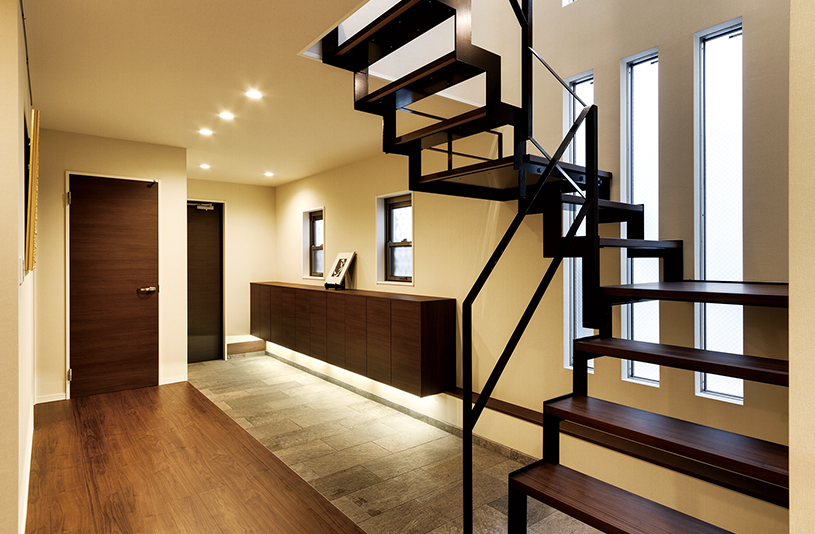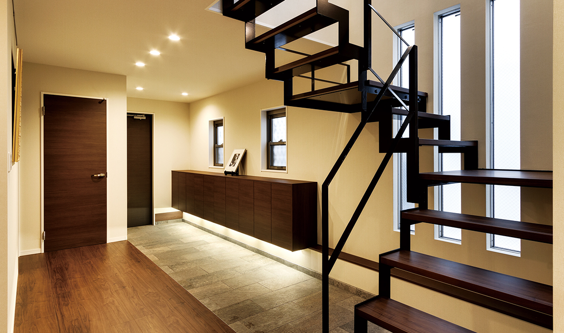 Y様邸を象徴するエントランスホールもモダンでシンプルなデザインで表現。デザイン階段がアクセントとなって、空間にシックな雰囲気を漂わせます。